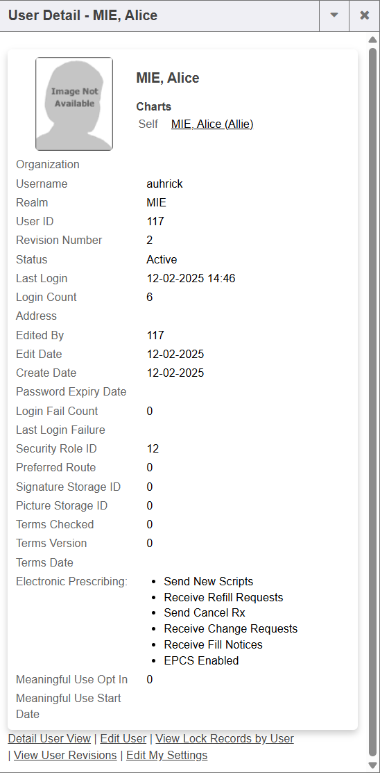 - The logged in user’s name and security role will display to the right of the person icon. If the logged in user has access to edit user profiles, the name becomes a clickable link that takes the end user to the user account information. Beginning with RC202603, the User Detail box has been updated to display Eprescribe feature enrollment statuses and Meaningful Use (Quality) opt-in status and start dates.